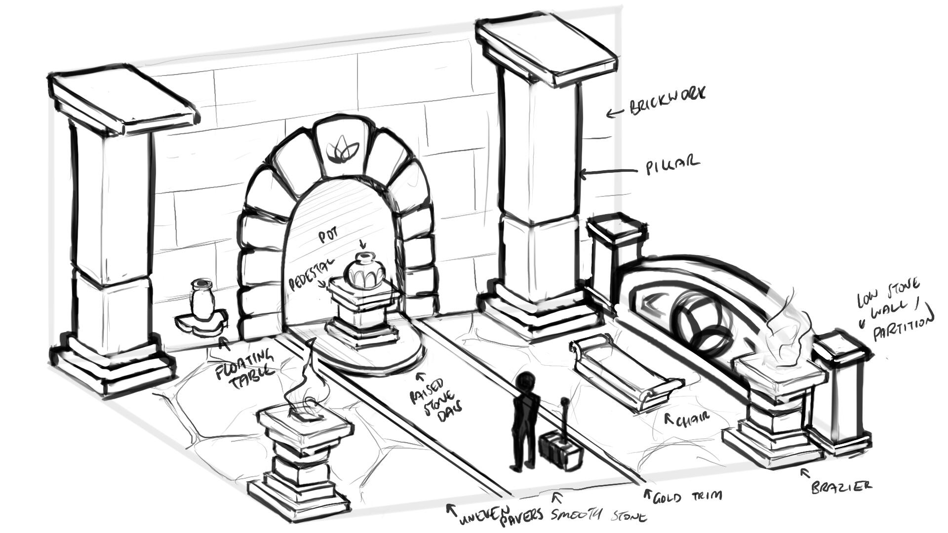 Having a clearer sense on style, I was also tasked with illustrating what will become our Art Diorama test scene. This involves staging items to get a feel for the level and then also creating the turnaround for the 3D Artist to work from.