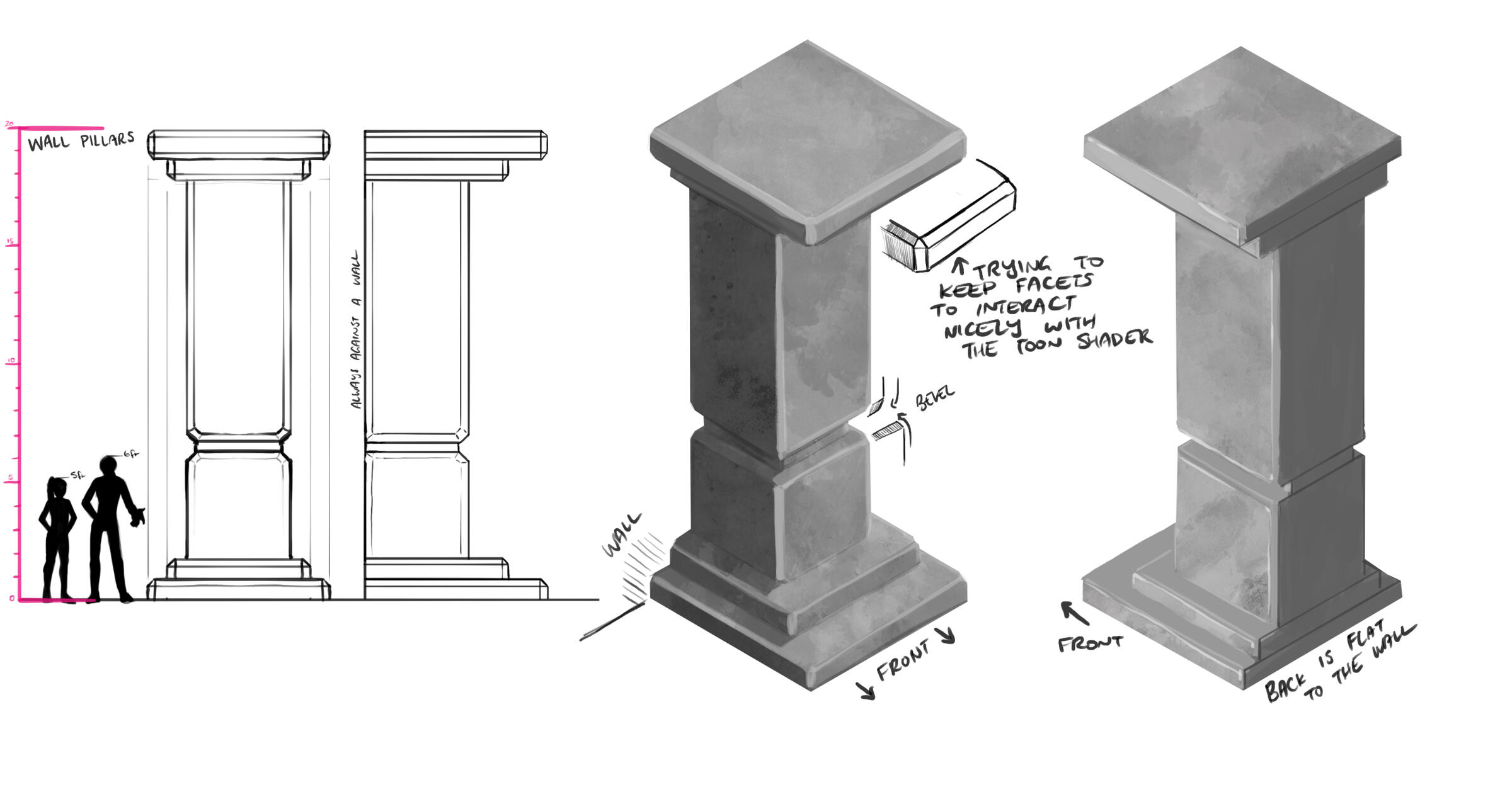 Having a clearer sense on style, I was also tasked with illustrating what will become our Art Diorama test scene. This involves staging items to get a feel for the level and then also creating the turnaround for the 3D Artist to work from.